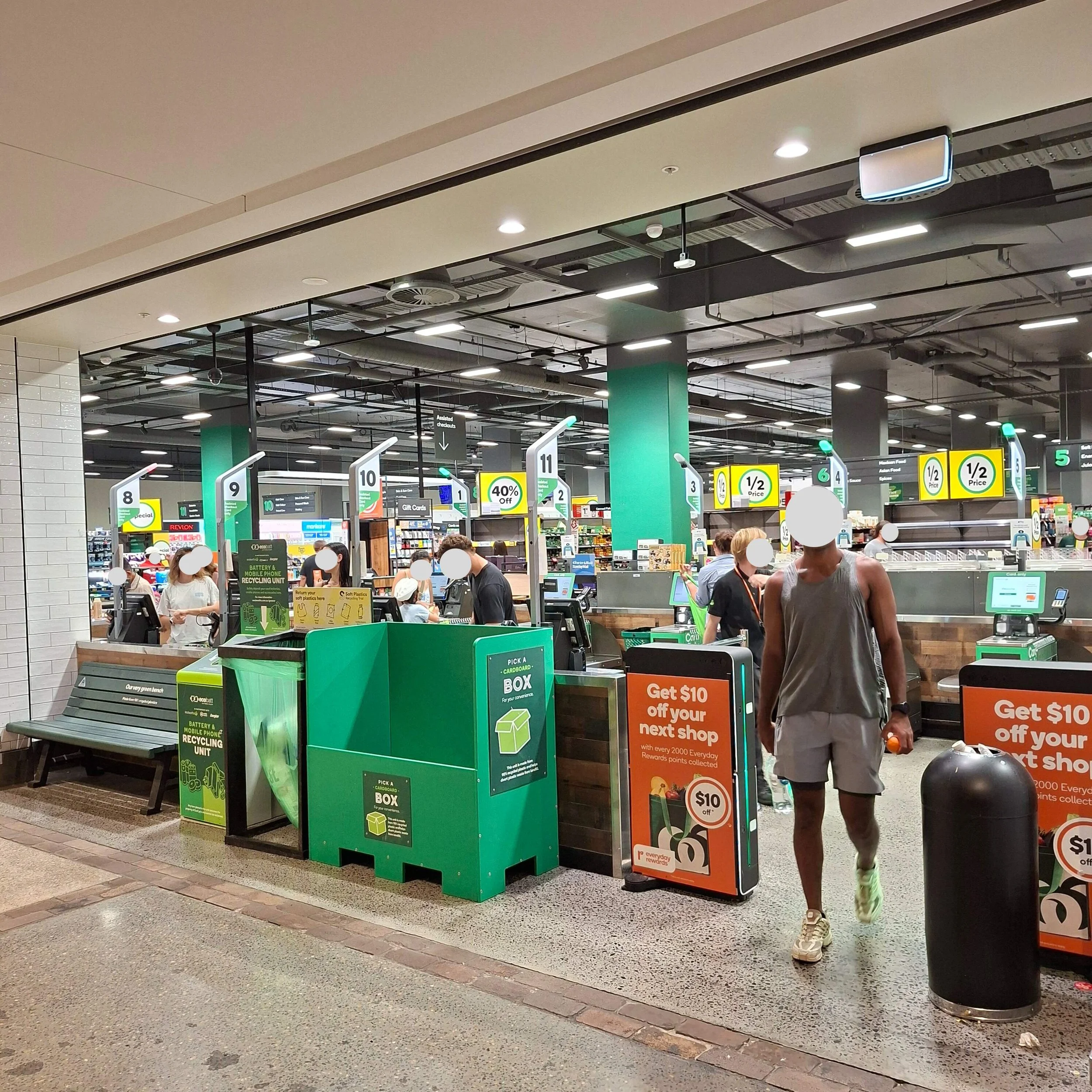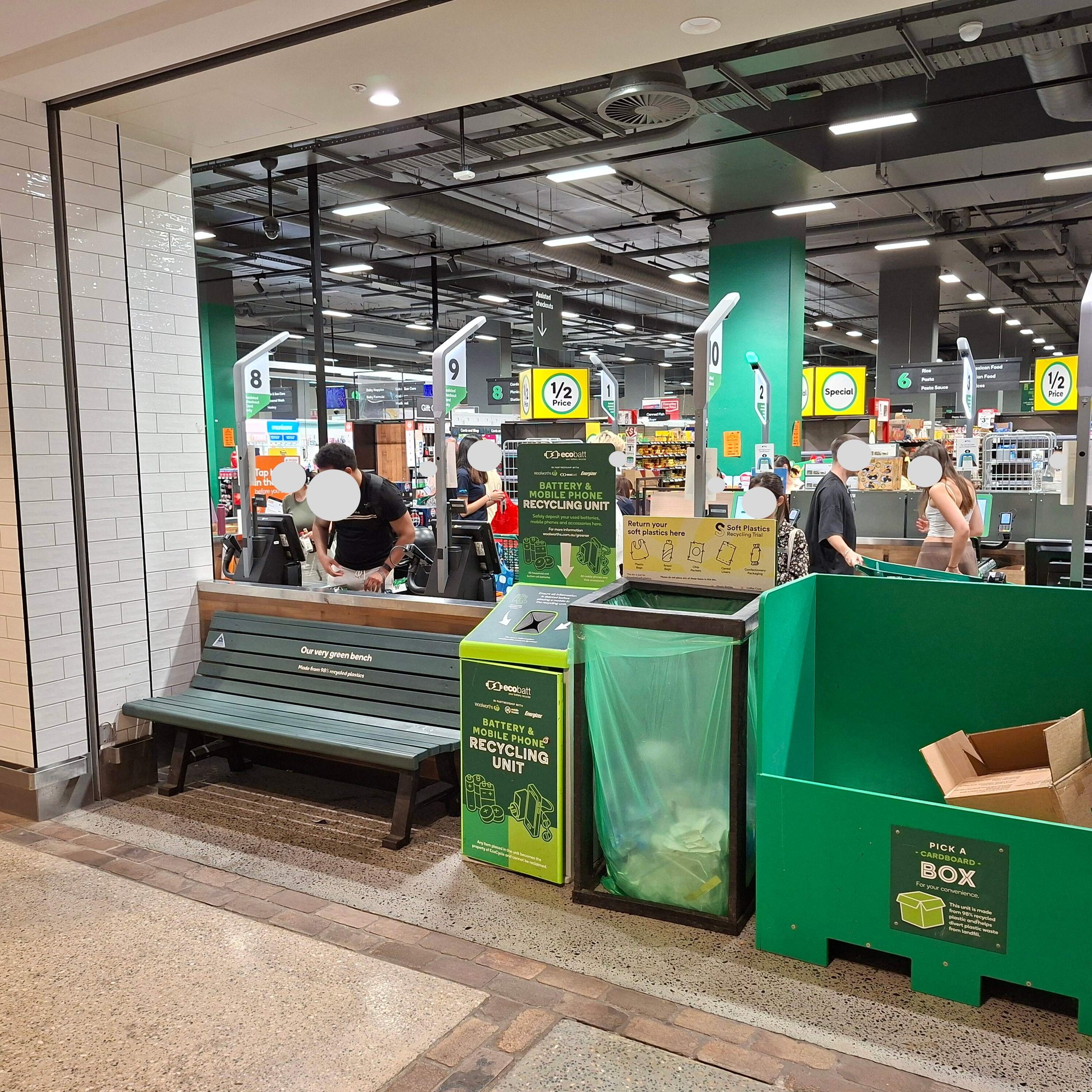 The fifth issue was visibility. The area is cluttered, and the bench is positioned between large objects like a column and recycling bins, making it hard to spot. The green Woolworths brand color is also used on many objects throughout the store, which causes the bench to blend into the background.