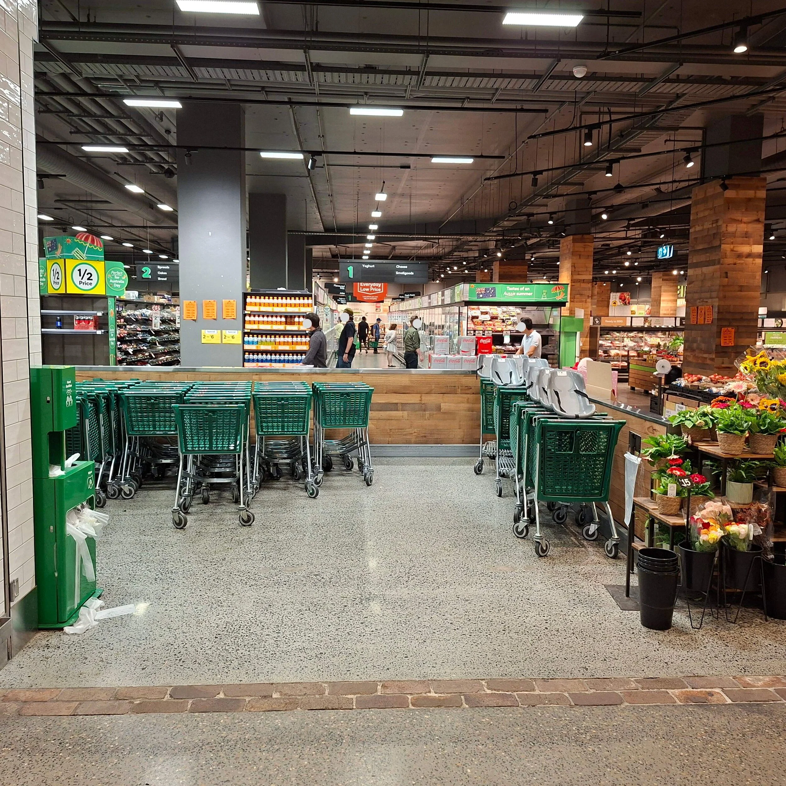 I looked around to identify a better spot for the bench. I noticed the green bench was designed to be stored behind the roller door when the store closes, so most available spaces were already occupied by the flower section or shopping cart areas.