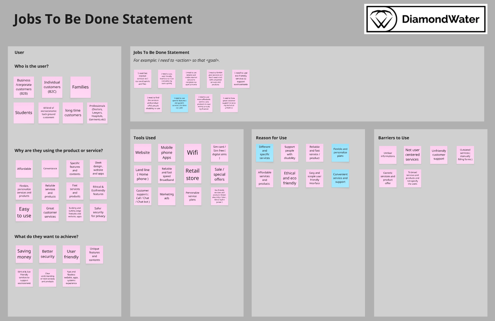 Based on the initial stakeholder interviews, I gathered further insights into HGH Telecommunications' current problems and user experiences. To make sense of this information, I mapped it out using multiple UX frameworks, and methods.